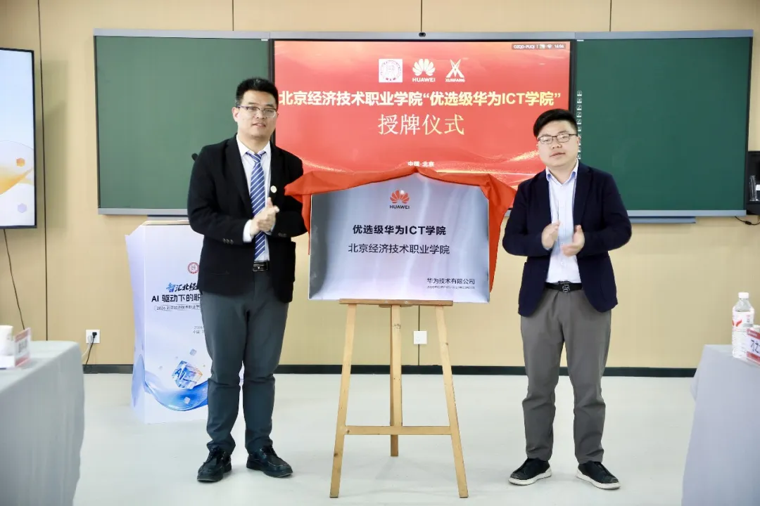 集体合影后,论坛迎来重磅环节——华为ICT学院授牌仪式。随着授牌完成,北京经济技术职业学院正式成为北京市第一所与讯方技术校企深度共建华为ICT学院的高职院校,这一里程碑式成果,标志着学校与华为、讯方的校企合作迈入深度融合、协同育人的全新阶段,也为北京地区职业院校AI人才培养树立了全新标杆。